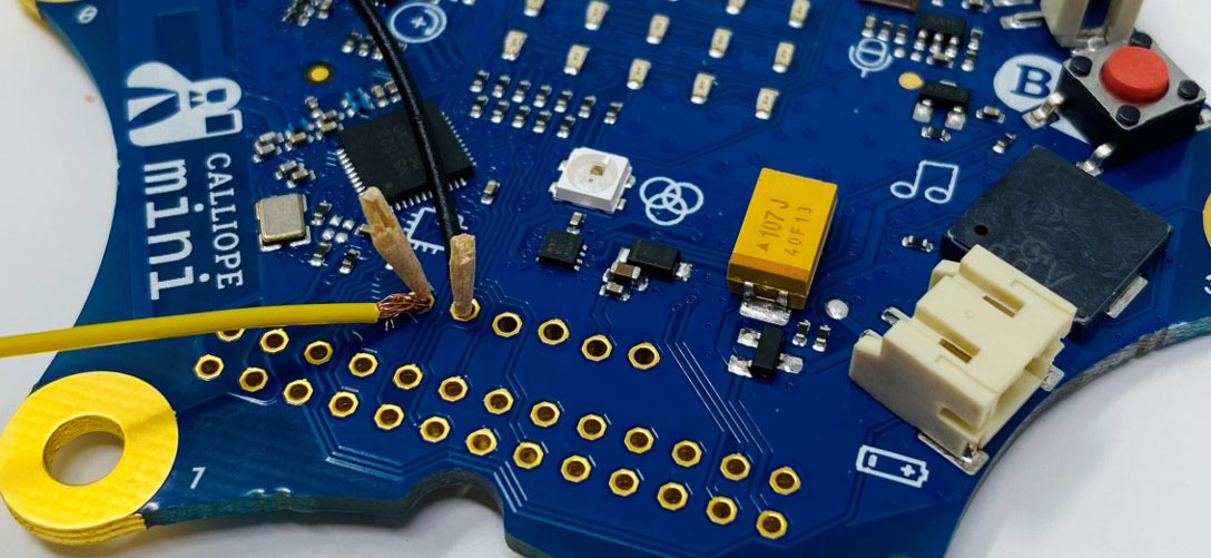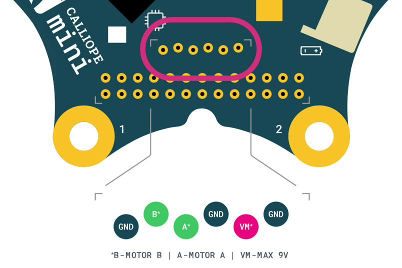 | Spannung | Der integrierte Motortreiber ist auf 9 Volt sowie 500 Milliamperes beschränkt. Höhere Spannungen können den Calliope mini zerstören! |