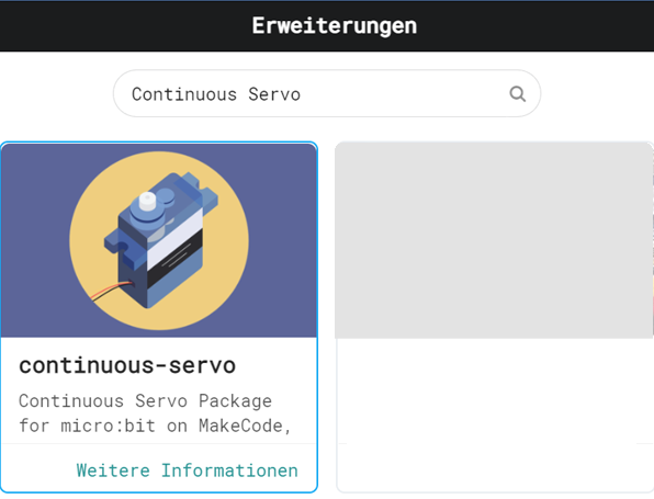 Für Makecode gibt es alternativ das Paket continous servo, dass als Erweiterung geladen werden kann, indem der folgende Link in die Suchleiste eingetragen wird: github.com/tinkertanker/pxt-continuous-servo