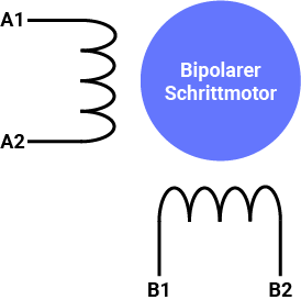Bipolare Schrittmotoren haben 4 Anschlüsse. Sie haben zwei Anschlüsse pro Spule. Der Vorteil von Bipolaren Schrittmotoren ist, dass sie effizienter sind, weil sie die ganze Wicklung der Spule verwenden. Der Nachteil ist, dass sie oft einen Treiber wie eine H-Brückenschaltung brauchen (ähnlich wie die DC-Motoren), damit die Polarität umgekehrt werden kann und dieser sich in die andere Richtung dreht.