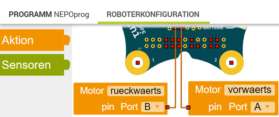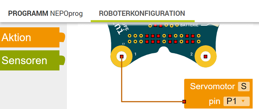 Im Open Roberta Lab, müssen zuerst der Pin für den Servomotor in der Roboterkonfiguration konfiguriert werden. Unter Aktion finden sich der entsprechende Servomotor-Block. Der Servomotor kann an jeden beliebigen analogen/PWM Pin konfiguriert werden.
