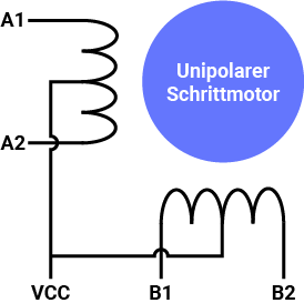 Unipolare Schrittmotoren haben meistens 5, manchmal auch 6 oder sogar 8 Anschlüsse. Die beiden Spulen werden in der Mitte mit der Phase verbunden und so halbiert. Dadurch, dass jede halbe Seite der Spule unabhängig magnetisiert werden kann, kann die Polarität umgekehrt werden, ohne den gesamten Stromkreis umzukehren. Nachteil bei der Nutzung der halben Spule ist eine reduzierte Magnetkraft und ein geringeres Drehmoment.