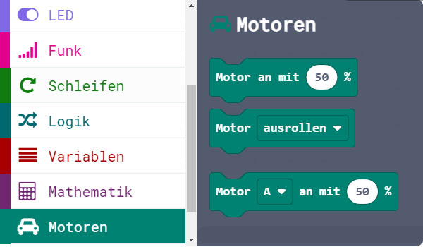 In Makecode sind die Motorblöcke under den Standardblöcken direkt zu finden