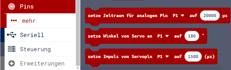 In Makecode befinden sich die Blöcke für die Servoansteuerung bereits in der Bibliothek. Diese finden sich unter den Fortgeschrittenen Blöcken unter Pins.