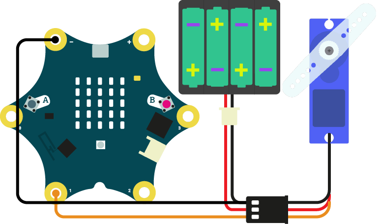 Wenn Servomotoren mit einer Nennspannung über 3.3V verwendet werden sollen, kann ein Batteriefach mit 4x AAA oder 4 x AA Batterien eingesetzt werden. Hier wird sowohl der Servomotor als auch der Calliope mini direkt über die Batterien versorgt. Die Spannung des Batteriefachs liegt mit 4x1.5V=6V über der zulässigen Spannung von 5V für den Calliope mini Batteriekonnektor. Über den VM Anschluss ist aber eine Versorgung weiterhin möglich.