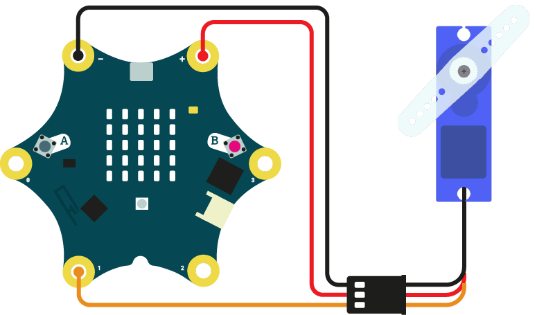 Servomotoren, die mit 3,3 Volt betrieben werden, können direkt über den Calliope mini mit Strom versorgt werden. Dazu wird VCC an den Pluspol und GND an den Minuspol der Krokodilklemmenanschlüsse/Touchpins verbunden. Es kann theoretisch jeder analoge Pin am Calliope mini für das Signal verwendet werden. Um jedoch bei den Touchpins zu bleiben, kann sowohl Pin P1, als auch P2 für das Signal verwendet werden.