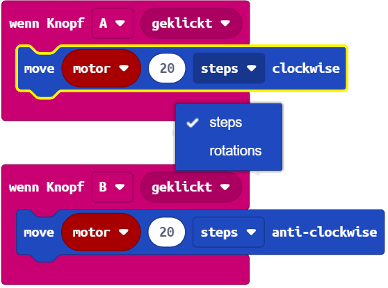Um den Schrittmotor vor- oder zurück zu bewegen können die folgenden "move"-Blöcke verwendet werden. Ein Schritt sind im Vollschrittmodus 11.25° Grad. Also braucht der Schrittmotor ungefähr 32 Schritte für eine ganze Umdrehung. In dem Block können sowohl, die Schritte, als auch volle Umdrehungen ausgewählt werden.