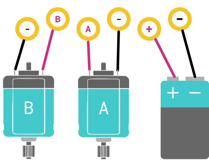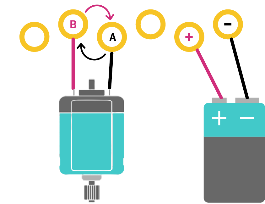 Falls ein Motor angeschlossen wird, können die beiden logischen Pins A und B miteinander mit dem Motor verbunden werden. Die Reihenfolge ob A mit dem Minuspol oder B mit dem Pluspol des Motors verbunden werden, entscheidet darüber in welche Richtung dieser sich dreht.