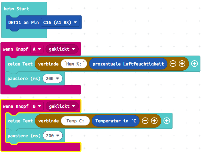 Anschließend können Temperatur und Luftfeuchtigkeit z.B. auf der LED-Matrix des Calliope mini angezeigt werden: