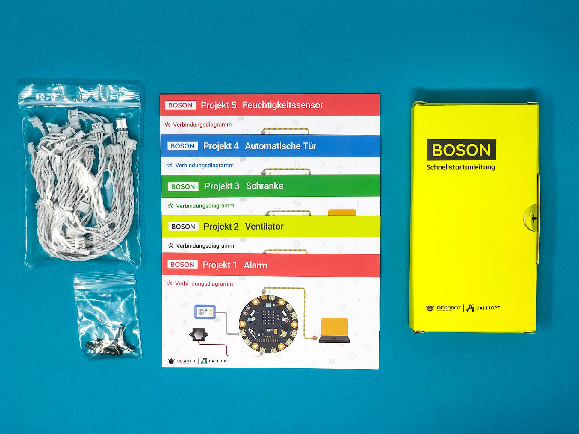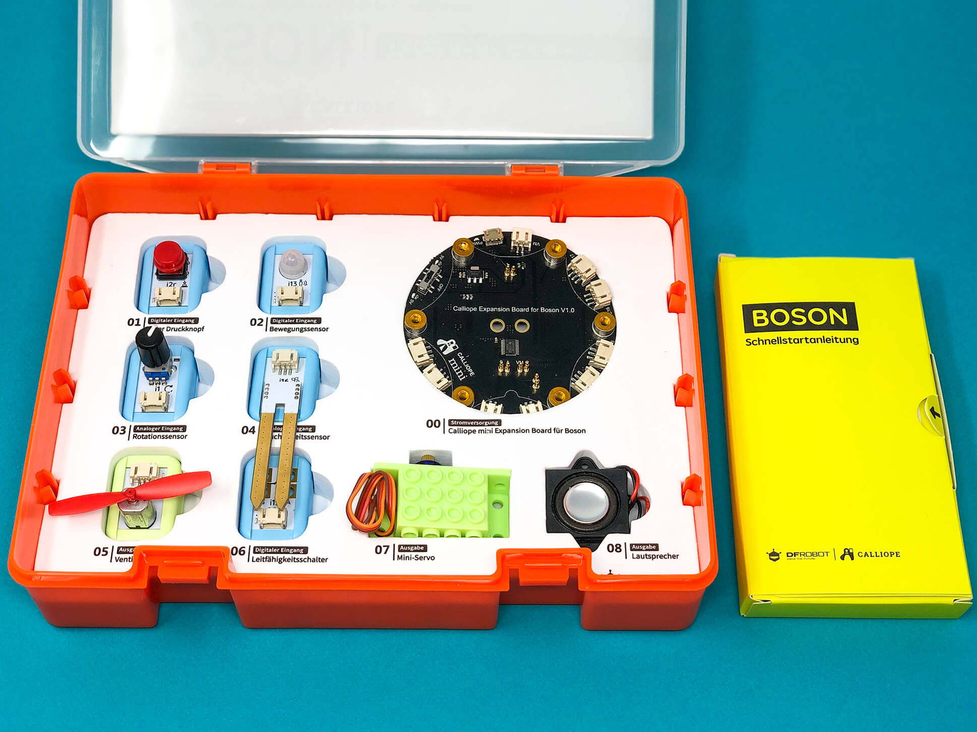 The Boson Kit is a practical set of modular electronic components for your Calliope mini. The kit contains eight selected modules that cover the most common digital and analog sensors and actuators and can be easily connected to your Calliope mini. Once you have connected the expansion board to your Calliope mini, you can connect all the modules directly by cable.