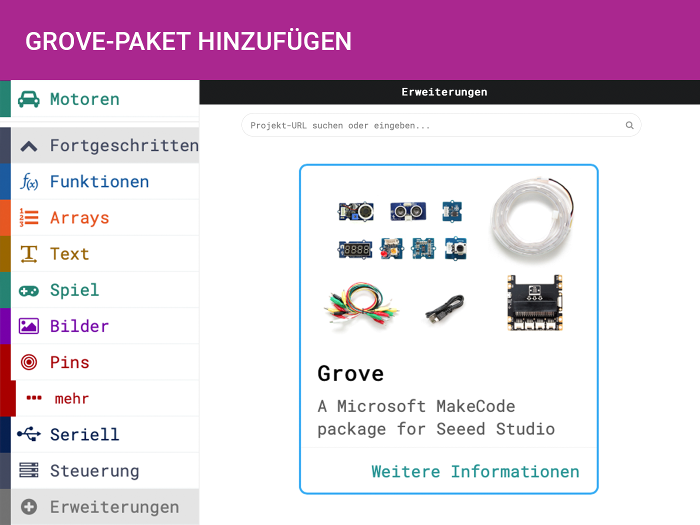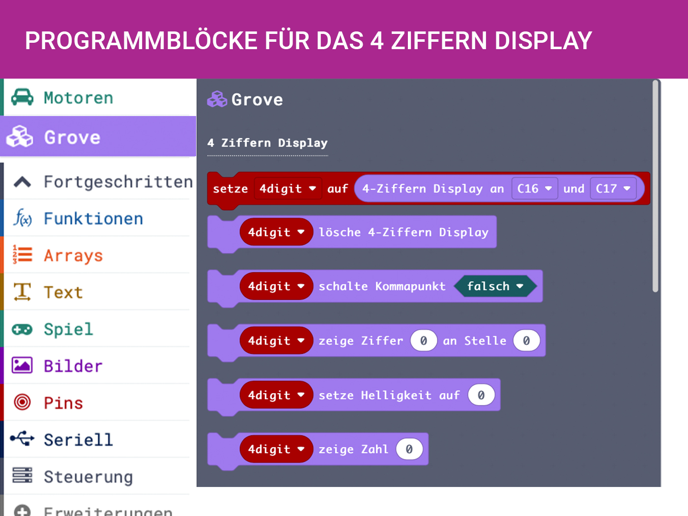 In Makecode, the sensor can be controlled via pins C16 and C17 after the Grove package has been downloaded. The numbers are displayed in macecode from left to right.