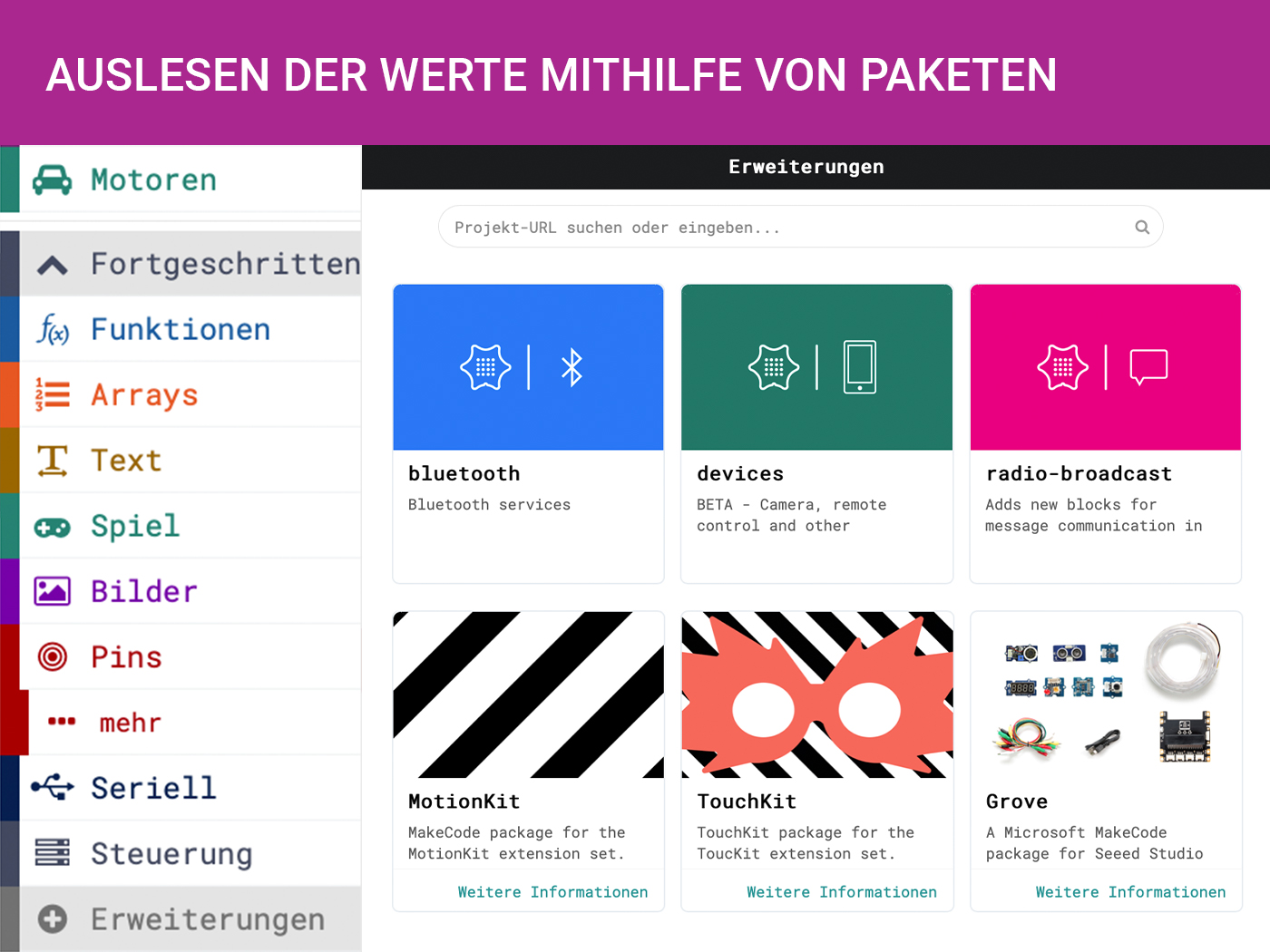 These can be added by selecting + extensions at the bottom of the components and entering e.g. "Grove" in the search bar at the top. Afterwards the new blocks can be found under the tab with the name of the added package. In the case of the Grove package, gesture recognition, ultrasonic sensors, etc. can then be used.