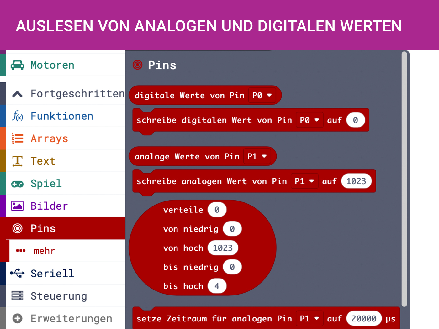 In general, the digital and analog sensors/actuators can be addressed by selecting Pins on the tab. With the block digital/analog values of Pin the sensor data can be read out. For the actuators the values can be sent with the block write digital/analog value of Pin to 0.