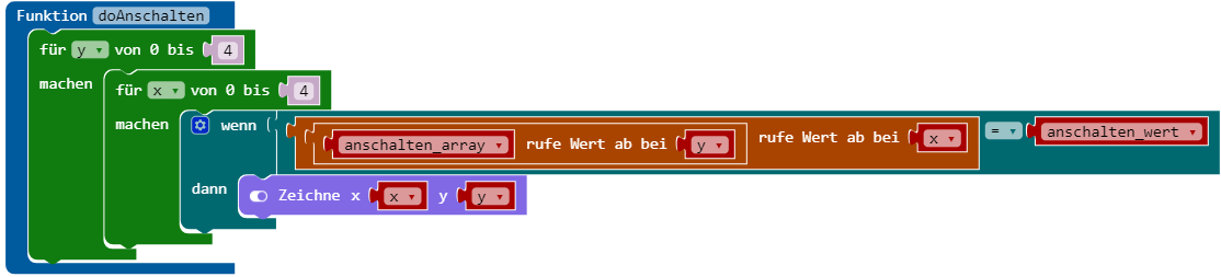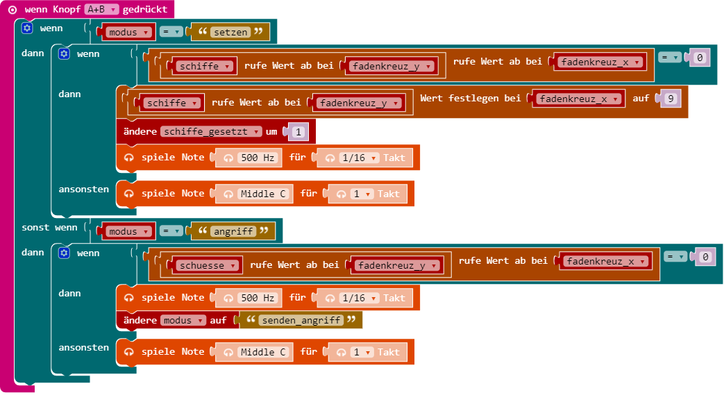 For the own ships and the own shots a multidimensional array is created. The multidimensional arrays each contain 5 arrays with 5 numbers, one for each LED (pixel) on the Calliope. The first dimension corresponds to the Y-value and the second to the X-value on the LED matrix. At the beginning all numbers are set to 0. In the course of the game these pixels are set to different values, each representing a certain state: