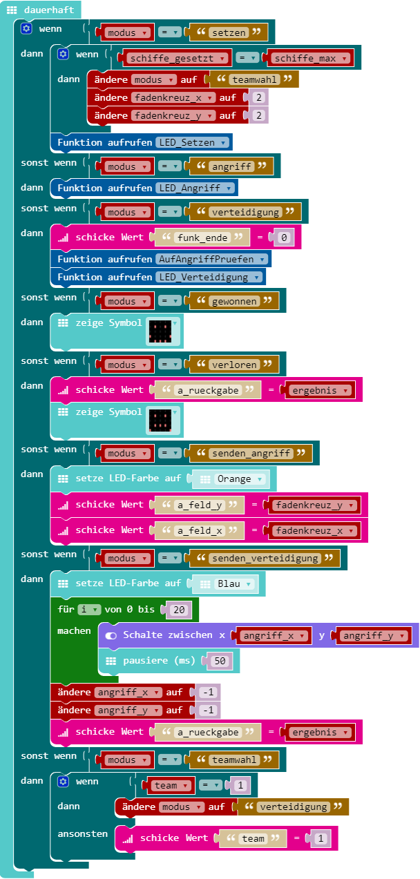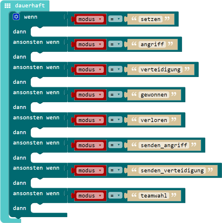 Next we define a variable in which the current mode is stored. Depending on which mode is active, the MINI should execute different code. In the permanent loop, this is done with an extensive if-then query. To start, the ships must be set, so we set the variable to "set ".