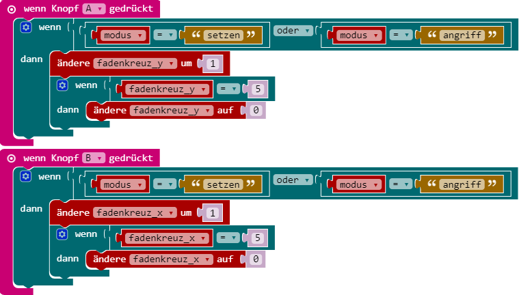 The LEDs on the Calliope Mini can be addressed via X and Y values. The first LED is x=0,y=0. The last LED is x=4,y=4. To set the "crosshairs" to start in the middle, the variables "crosshair_x " and "crosshair_y " are both set to 2.