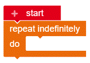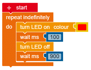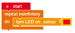 1.At the beginning you create a loop. This means that a command is executed again and again. You find the block in the category Control. Put together the blocks Start and Repeat indefinitely. Insert the turn LED on block from the section Action into the loop. What does the program do? You can write it down.
