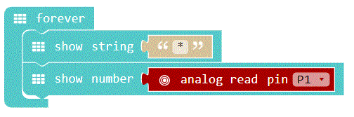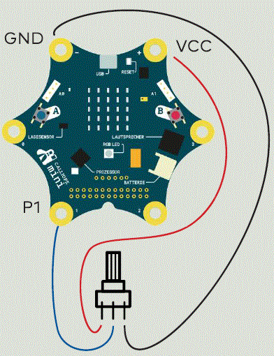 Clamp an adjustable resistor (potentiometer) to the Calliope mini. Turn the potentiometer to different positions and show its numerical value on the LED display.