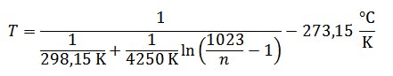 If the digitization and the relationship between the temperature and the measuring voltage are now combined, the temperature can be calculated from the digitized value n. The temperature can then be calculated from the digitized value n.