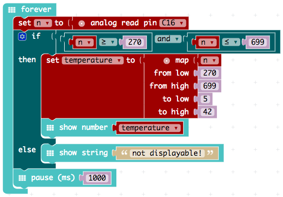 Somewhat rather difficult is the use of the MakeCode PXT editor. This editor only supports integer arithmetic. But this editor has a mapping block "distribute", which can distribute one range of numbers evenly to another range of numbers.