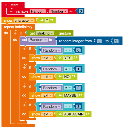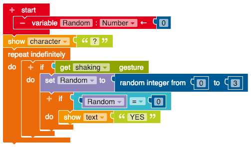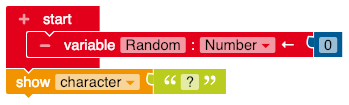 Now add another if - do block and add the block = from the logic menu to it. Now you fill the block with the random variable, from the variables menu and a 0 to set the condition for the value zero of the variable. Then take a show text block and enter your answer in the text box.
