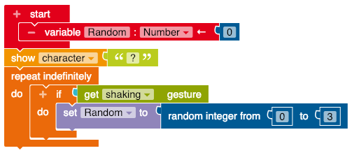 Now select the if - do block under control to set the condition. Then add the get shaking gesture from the sensors menu to control the position sensor. In the selection change upright to shaken.