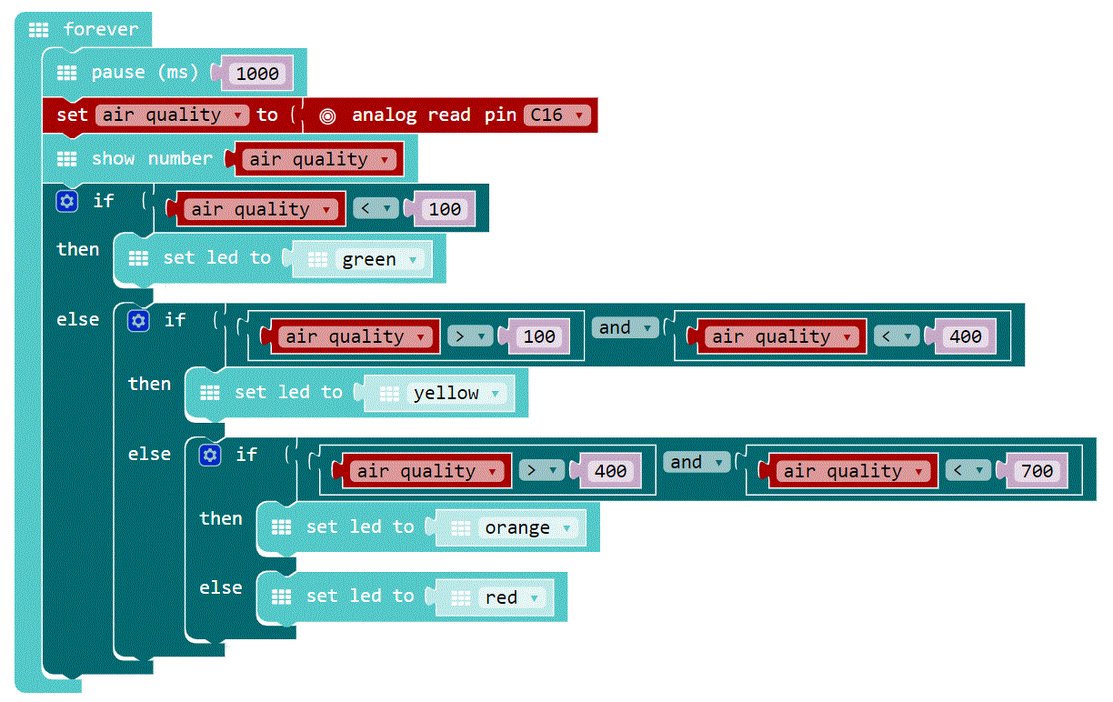 The sensor actually has only one pin, which is read out analog. Use the right Grove connector on the Calliope mini and read out pin C16 analog. At the beginning you should wait 20 seconds, because the sensor has to be warmed up to reach its operating temperature.