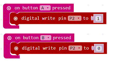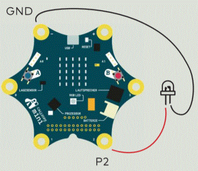####Connect an LED to the Calliope mini. When you press button A, the LED turns on. If you press button B, the LED will turn off again.