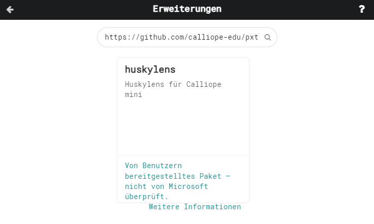 Als erstes muss die HuskyLens-Bibliothek importiert werden. Dazu muss in MakeCode auf die fortgeschrittenen Blöcke Erweiterungen geklickt und der folgende Link in die Suchzeile eingegeben werden: https://github.com/calliope-edu/pxt-huskylens