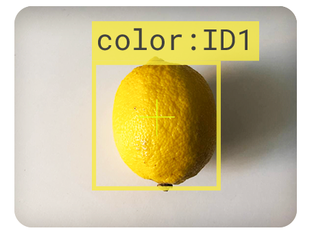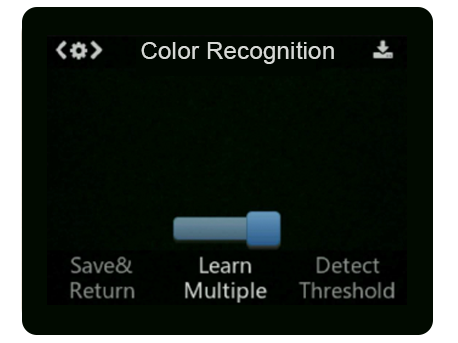 Indem eine Farbe fokussiert wird und der rechte "Lern-Knopf" (2) gedrückt wird, merkt sich die KI die Farbe. Wenn der Knopf länger gedrückt wird, kann die Farbe aus verschiedenen Winkeln und Entfernungen gelernt werden. Anschließend sollten die gleichen Farben in einem farbigen Kasten mit einer zugeordneten ID betitelt und wiedererkannt werden. Drücke erneut auf den "Lern-Knopf" (2) bevor der Countdown abläuft, um eine weitere Farbe zu lernen oder den Funktions-Knopf/das Rädchen um abzubrechen.