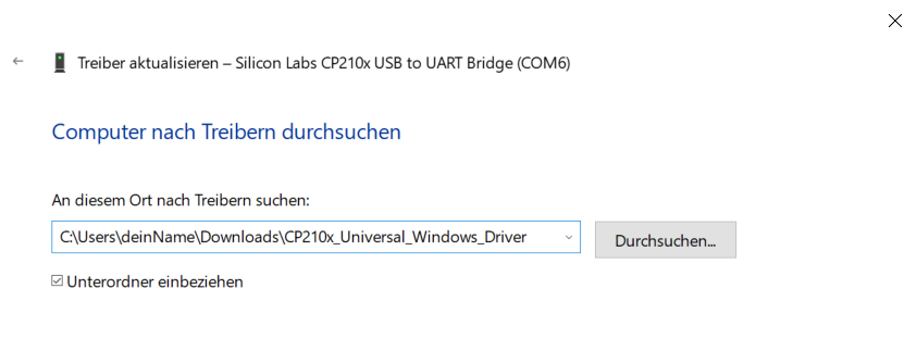 Klicke auf "Treiber aktualisieren", anschließend auf "auf meinem Computer nach Treiber suchen" und wähle den Downloadpfad des Treibers aus.