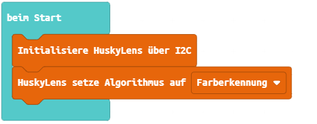 1. Um zu starten, muss die HuskyLens erst im Startblock initialisiert und der jeweilige Algorithmus ausgewählt werden - in diesem Fall "Farberkennung".