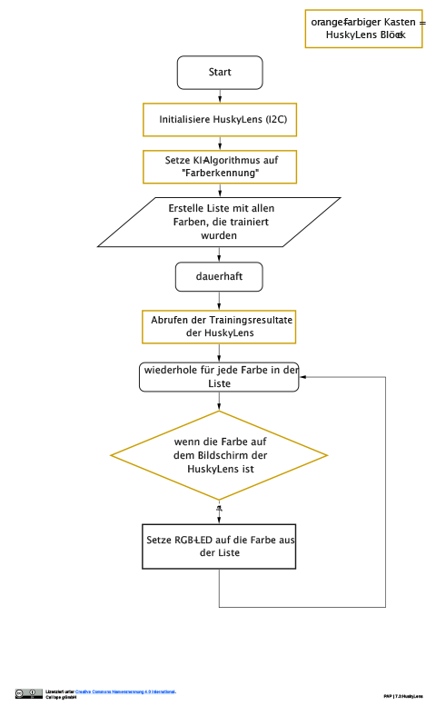 Um zu starten, muss die HuskyLens erst im Startblock initialisiert und der jeweilige Algorithmus ausgewählt werden - in diesem Fall "Farberkennung".