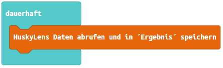 Um die Daten der HuskyLens für die trainierten Farben (IDs) dauerhaft abzurufen, wird der Block "HuskyLens Daten abrufen und in 'Ergebnis' speichern" verwendet.