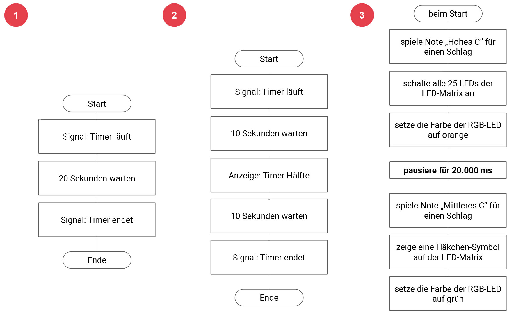 Beginne dein Programm mit einer Melodie, einer leuchtenden RGB-LED und einer Anzeige auf der LED-Matrix. Starte danach einen Timer mit einer Länge von 20 Sekunden. Wenn der Timer abgelaufen ist, wiederhole die Anfangssequenz mit anderen Parametern - einer anderen Melodie, einer anderen Farbe der RGB-LED und einem anderen Symbole auf der LED-Matrix.