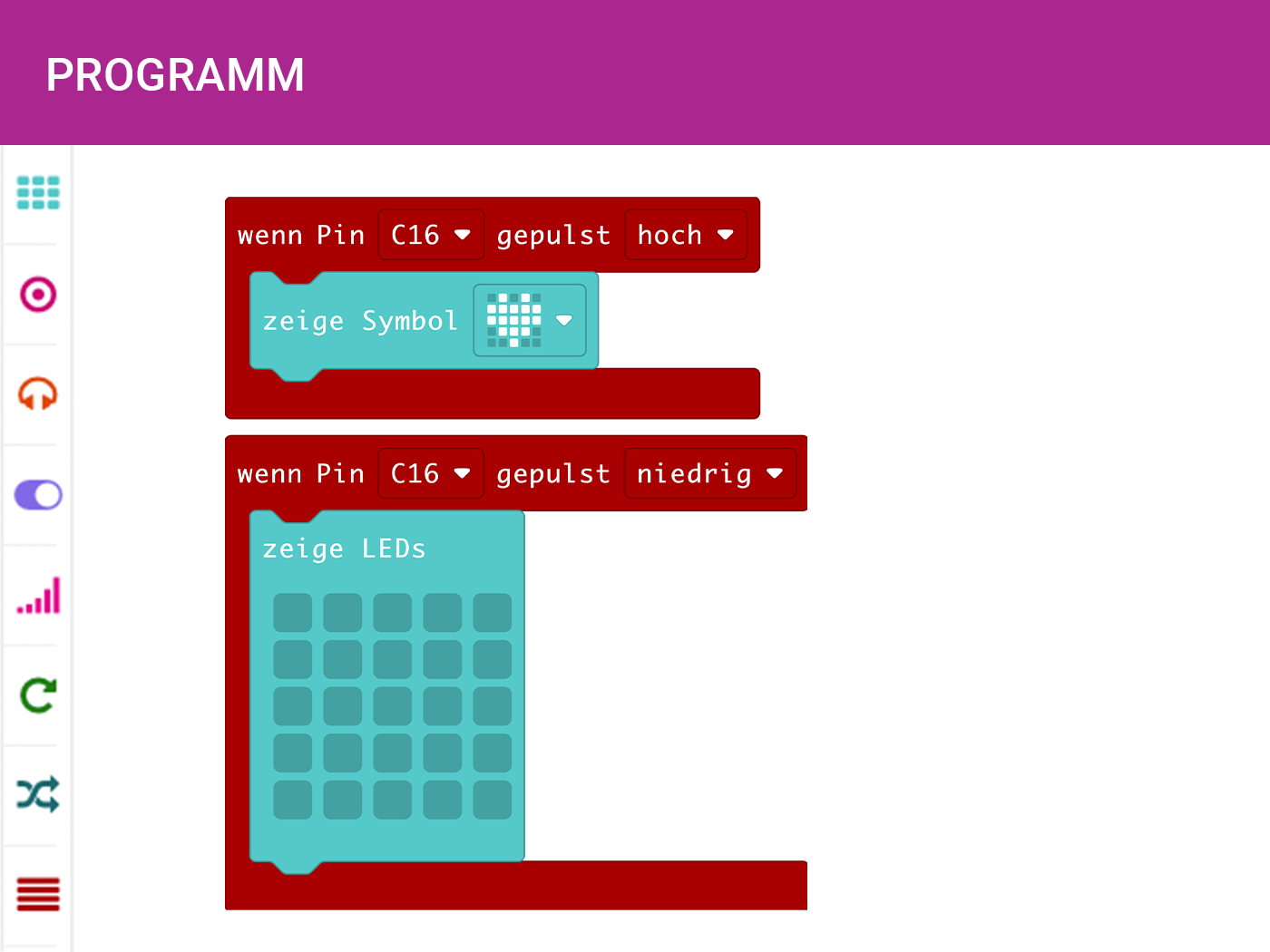 Si el pulso late, entonces se mide un aumento de voltaje a través de la clavija C16. Esto se puede comprobar en los bloques avanzados en "Pins > ...more" con el bloque "si el pin P0 pulsó alto". Todo lo que queda por hacer es seleccionar la clavija correcta, en este caso la C16, y se puede encender un LED al mismo tiempo que el pulso. Si el pulso es bajo, es decir, en "bajo", el LED puede ser apagado de nuevo a través del mismo bloque.