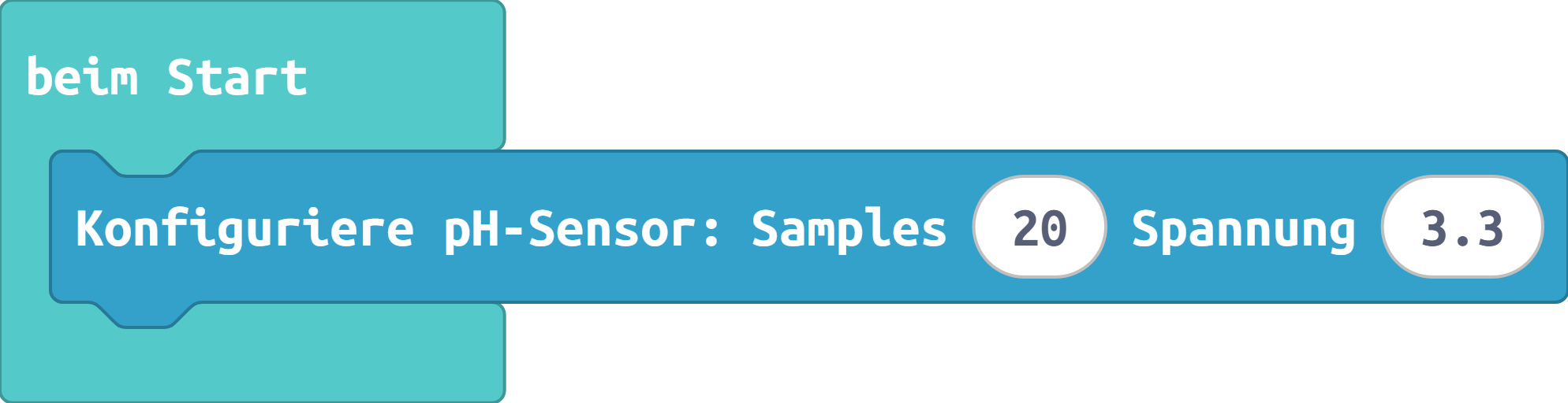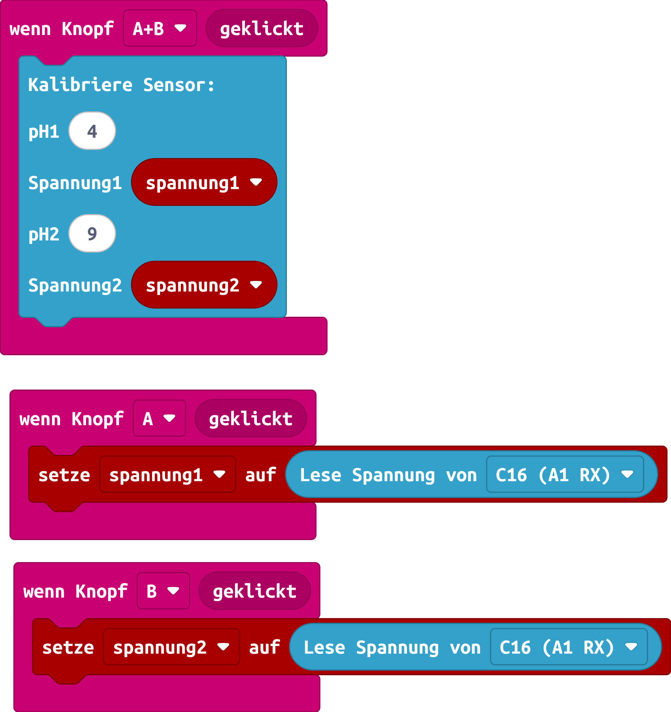 Damit der Sensor verlässlich funktioniert muss dieser zuvor mit zwei Referenzflüssigkeiten mit bekanntem pH-Wert kalibriert werden. Dazu die Spannung der beiden Flüssigkeiten mit bekanntem pH-Wert mit "Lese Spannung von C16" separat messen und beispielweise in einer Variable speichern. In dem Block "Kalibriere Sensor" die beiden bekannten pH-Werte und jeweils gemessenen Spannungen z.B. beim Start eintragen.