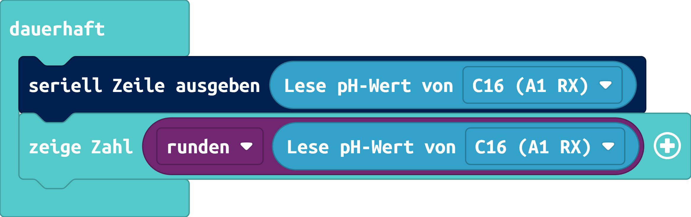 Anschließend kann mit dem Block "Lese pH-Wert von..." der PH-Wert von Flüssigkeiten im Bereich von 0 - 14 an dem entsprechenden analogen Pin gemessen werden. Trinkwasser liegt im Bereich zwischen 6,5 und 9,5. Ein Neutraler PH-Wert liegt bei 7.