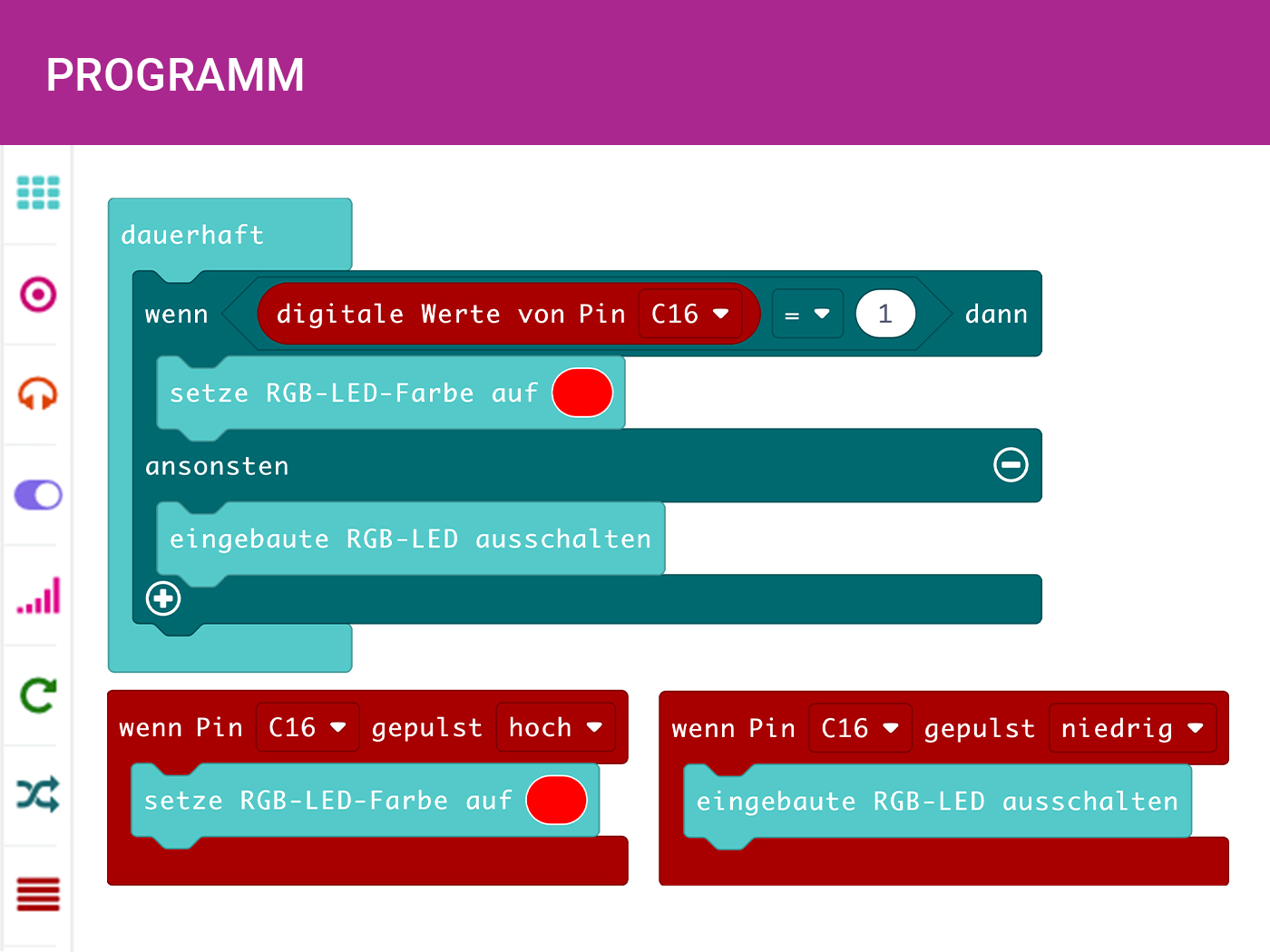 La segunda variante se puede implementar con el bloque "si el pin P0 pulsó alto" que se puede encontrar en "Pin > más". Para ello, el pin debe estar ajustado a C16, lo que significa que se puede realizar cualquier acción, como encender el LED de estado.