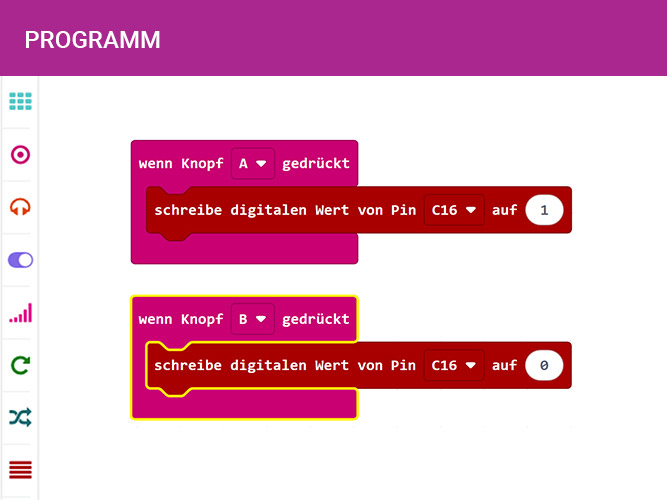 Se puede seleccionar una acción/condición para encender o apagar el relé. En el ejemplo del archivo HEX, los dos eventos clave para A y B se utilizan para cerrar el circuito. El valor digital de escritura de la clavija x a la clavija 0 se puede encontrar en los bloques avanzados de clavija. La clavija debe estar en C16 del conector A1.