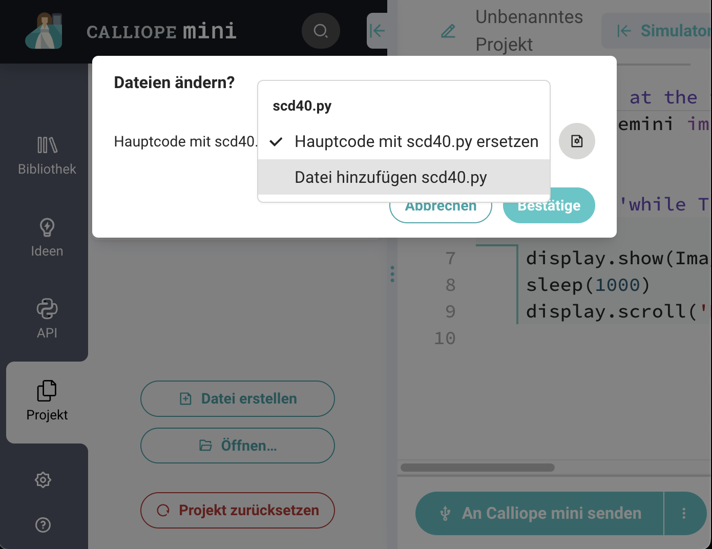 In dem Pythoneditor klicke auf den Reiter "Projekte" und anschließend auf "Öffnen..." um eine Datei in dein Projekt zu laden. Wähle die Datei scd40.py aus und füge sie zu deinem Projekt als weitere Datei hinzu, indem du in dem Dialog "Datei ändern" das kleine Icon klickst und "Datei hinzufügen" auswählst.