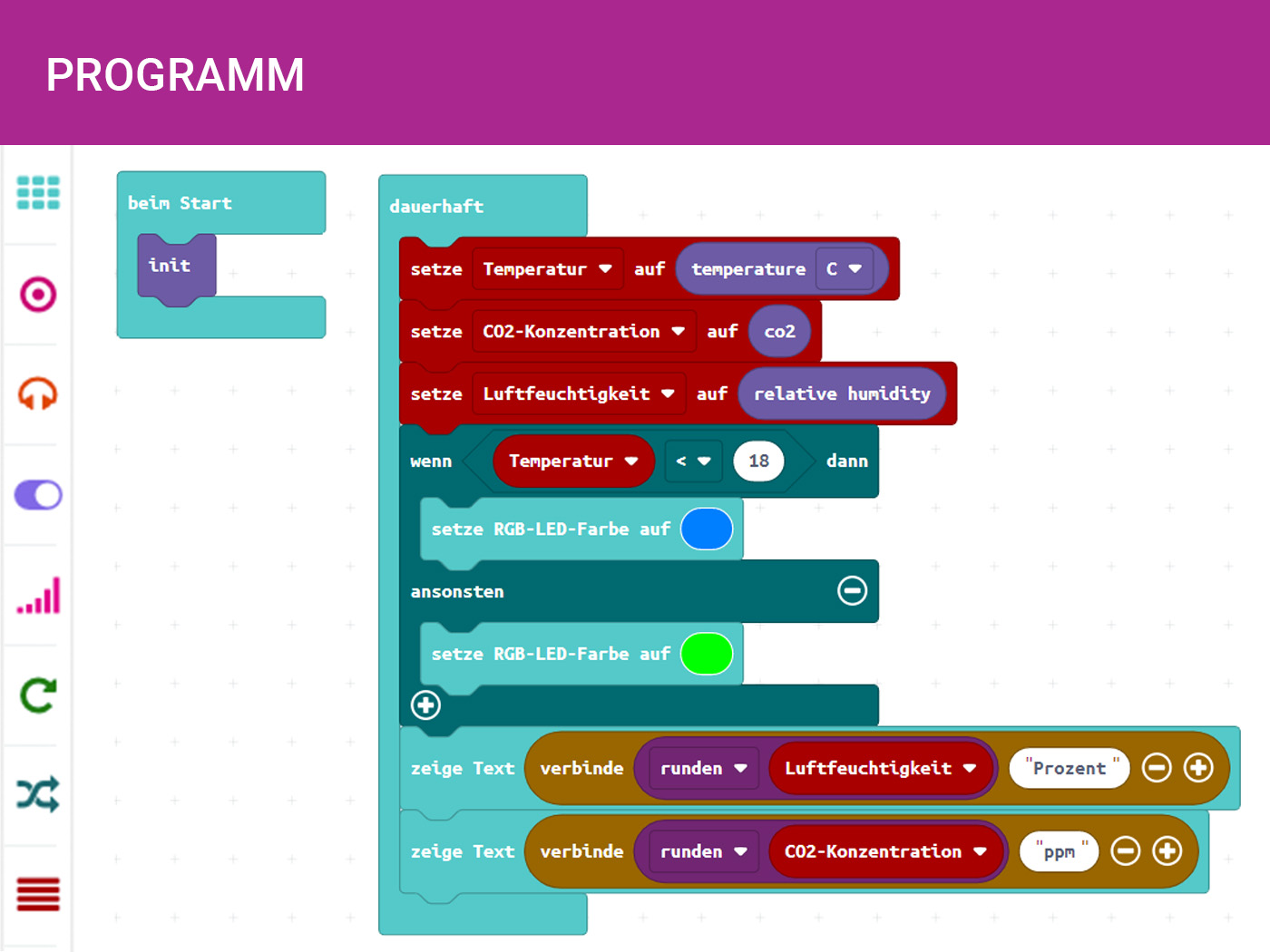 Dass sich die Umweltfaktoren Temperatur, Luftfeuchtigkeit und CO2-Konzentration infolge des Klimawandels auf der Erde verändern werden, ist heute unumstritten. Mit dem Calliope mini können diese Daten gesammelt und ausgewertet werden. Dieser Sensor kann aber auch dazu dienen die Co2 Konzentration im Klassenraum zu messen oder optimale Wachstumsbedingungen für Zimmer-, oder Gewächshauspflanzen zu schaffen.