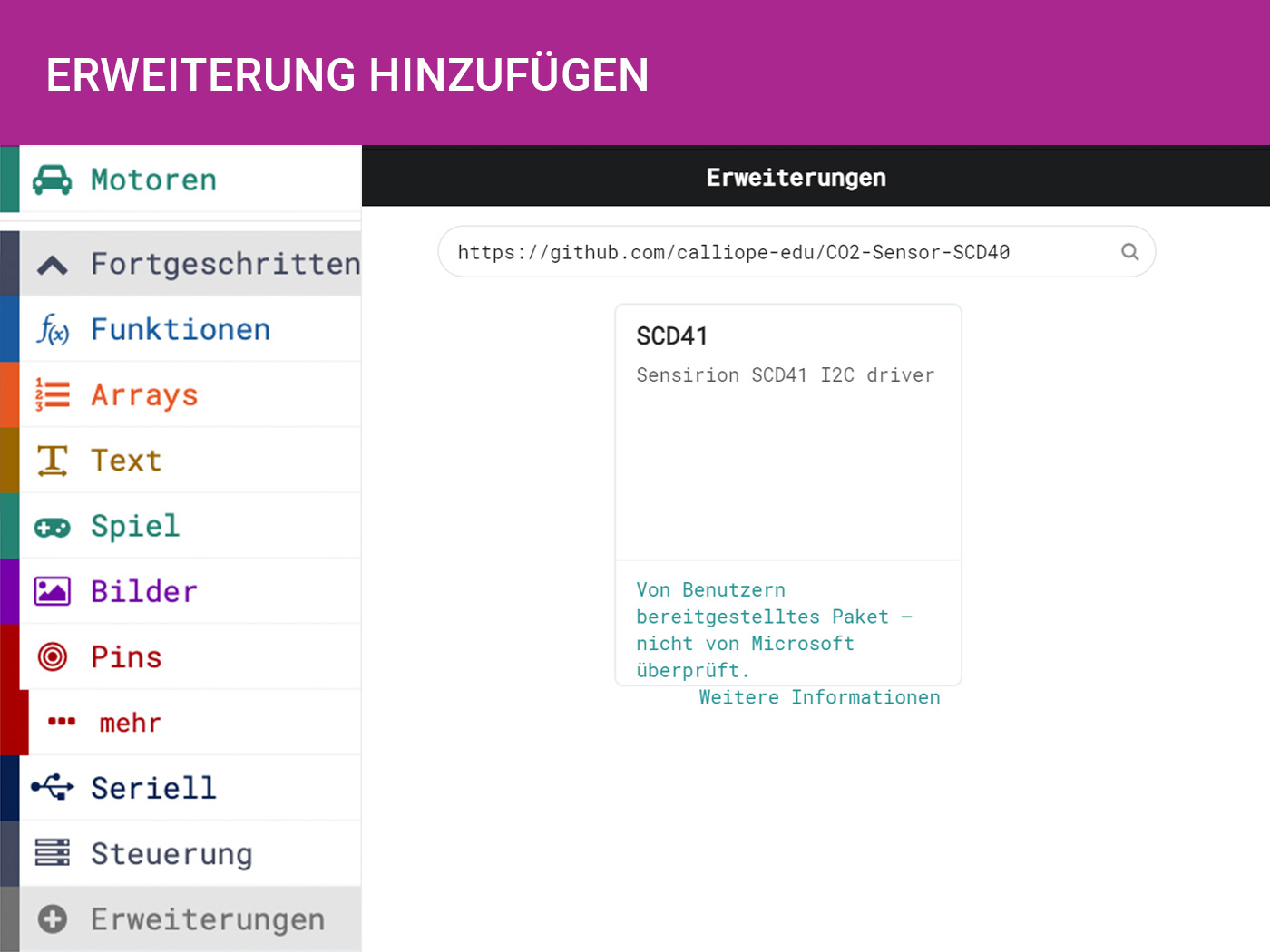 Zuerst muss das MakeCode-Paket für den Sensor geladen werden. Das funktioniert, indem man auf Fortgeschritten > Erweiterungen klickt und den Sensor aus der Liste der angebotenen Sensoren auswählt oder in der Suchleiste oben den folgenden Link eingibt: