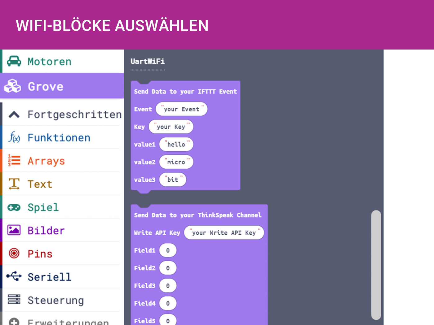 Das WiFi-Mdoul kann als Erweiterung in Makecode über die Grove-Bibliothek github.com/Seeed-Studio/pxt-grove hinzugefügt werden.