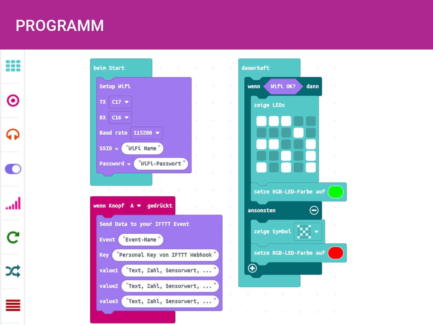 Der UART WiFi V2 wird an den A1 Anschluss angeschlossen. Die Verbindung mit dem WiFi-Netzwerk erfolgt über den entsprechenden Baustein über die Eingabe des Netzwerknamens (SSID) und des Passworts. RX (Eingang) ist C17 und TX (Ausgang) C16.