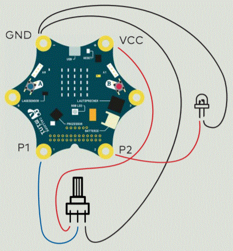 ####Sujete una resistencia ajustable (potenciómetro) y un LED a la Calliope miniatura. El LED se atenúa girando el potenciómetro.