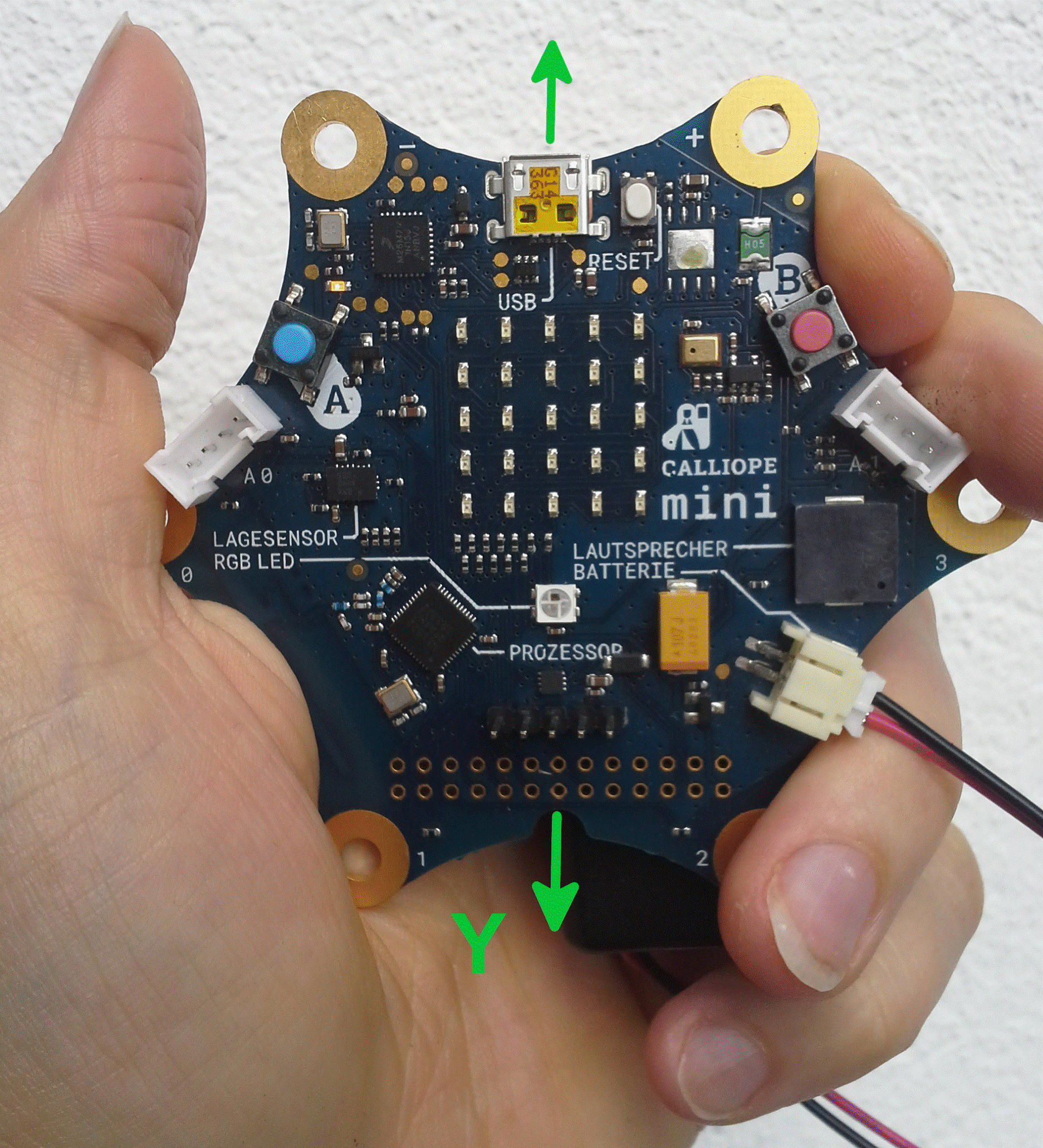 Cuando salte, lo mejor es sujetar el Calliope mini en la mano así.