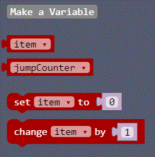 - Cambie la palabra "item" por "jumpCounter". Para ello, pulse la flecha pequeña del bloque y, a continuación, haga clic en la palabra "item".