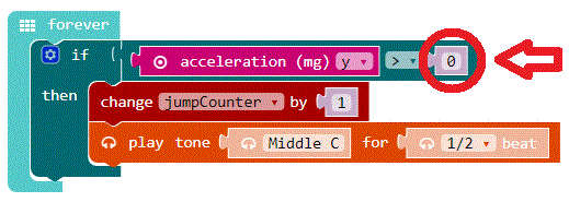 Oh, esa es la razón: El Calliope mini incluso cuenta si no saltas, ¡pero sólo lo tocas! Es por eso que tienes que hacer que este número sea más grande - alrededor de 2000 o así....