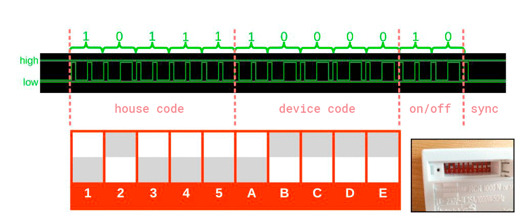 Los 12 bits incluyen un código de casa (el código establecido en el mando a distancia), un código de dispositivo (establecido con el código de casa en el enchufe) y la señal de encendido (10) o apagado (01). Al final, se transmite otra señal de sincronización (una vez alta y corta) como carácter para el final del código.