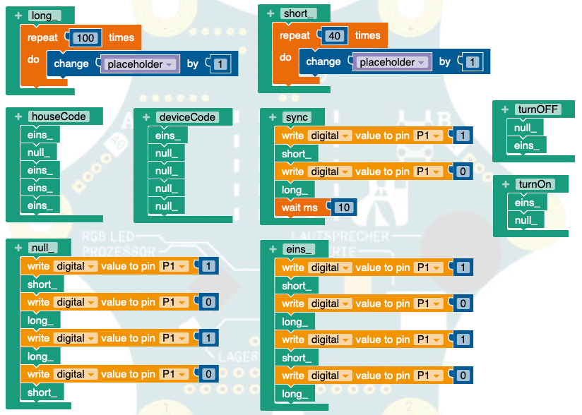 En la cabecera del algoritmo se definen varias subrutinas. Las dos funciones short_ y long_ tienen la tarea de pausar la función Calliope mini por un tiempo definido. Como la espera de comandos proporcionada en el editor desafortunadamente no permite las pausas cortas necesarias, utilicé los dos bucles (aumento de una variable de marcador de posición en 1), que generan las pausas de aproximadamente 1000 μs (largo) y 400 μs (corto). Las dos funciones one_ y null_ generan el bit correspondiente en el pin 1 utilizando los subprogramas para la longitud de impulso. Las otras funciones contienen la secuencia de bits para el código de la casa y del dispositivo establecido en el ejemplo, los códigos respectivos para la señal de encendido o apagado y la sincronización.